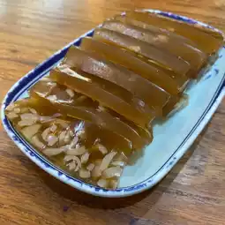 The jelly skin is icy and cool, with a smooth and chewy texture. It has only a light salty taste when eaten alone, but it has a richer flavor when paired with a special sauce, giving a refreshing and appetizing feeling.