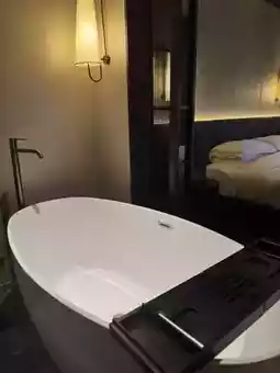 In addition to looking at the decoration, I prefer to look at the details: the bedding and bath supplies are all of five-star standard. The bristles are very soft and have just the right amount of force so as not to scratch the gums. The bathrobe is made of silky smooth material and can be worn comfortably next to the skin. 🩷 The quilt is of course my favorite down quilt, which is thick and very comfortable. A bathroom bathtub with a simple wooden chair for clothing is a great example.