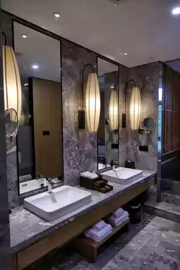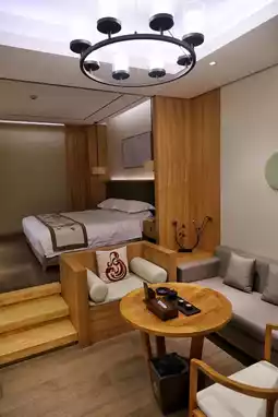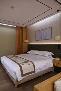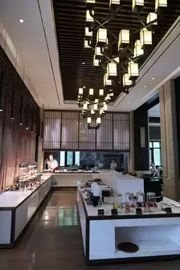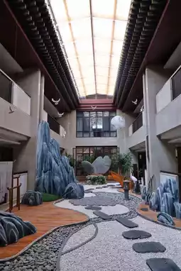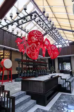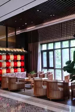 The lobby's paper-cutting bells throughout the hotel's murals guqin furnishings