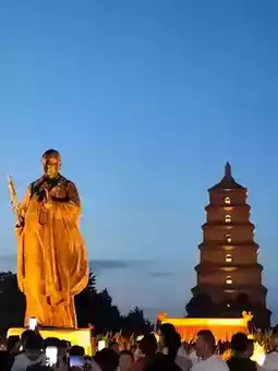 The statue of Xuanzang under the 1300-year-old Big Wild Goose Pagoda