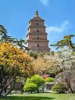 At dusk, the setting sun paints the pagoda a warm golden color. The light and shadows extend across the temple courtyard, interweaving with the shadows of the trees and giving the surrounding ancient buildings a soft outline. What's truly breathtaking is when night falls, the pagoda and the square illuminated. Its shadow is reflected on the stone slabs, and in the distance, a musical fountain or light show echoes with the pagoda. The entire Big Wild Goose Pagoda whispers millennia of Buddhist wisdom and Xi'an's history.