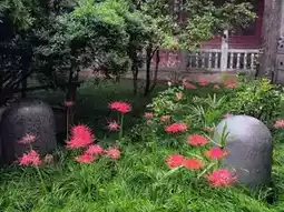 Behind Daxingshan Temple, there's a small path that many people might overlook. From late September to early October, the garden is lined with red spider lilies (彼岸花), or spider lilies. The bright red flowers contrast beautifully against the gray temple walls, creating a simple yet powerful image.
