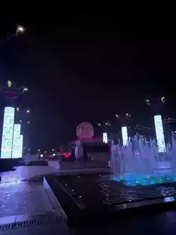 2. Reflected Sculptures by the Pool — At night, three impressive sculptures light up, mirrored by a serene pool with the city’s illuminated skyline as your insta-worthy backdrop. If you love architecture and outdoor landscapes, this spot is a must.