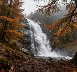 The Ice Crystal Peak at 3,015 meters elevation, where sea of clouds and colorful forests intertwine like a painting; by the Hanging Sky Waterfall, red leaves blaze like fire, beautifully contrasting with the water; the thousand-meter stone sea glows with a bronze sheen under the autumn sun, like a mysterious totem of nature.