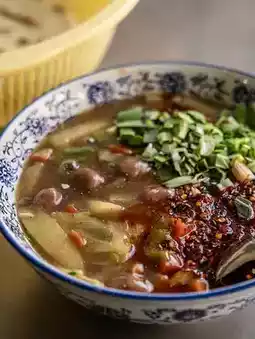 A relic of the Zhou Dynasty: thin noodles in a fiery red broth with vinegar, minced meat, tofu, and wood-boring mushrooms. Spicy, aromatic, unforgettable!