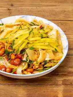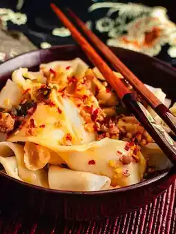 The name comes from the sound the dough makes when slapped on the table. The wide (3-5 cm!) noodles are generously drizzled with hot oil, black vinegar, and garlic. With lamb and Sichuan peppercorns, it's a flavor explosion!