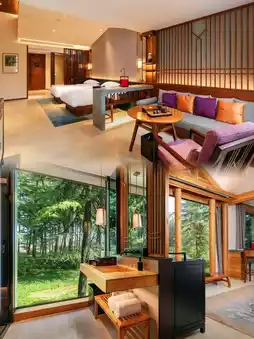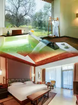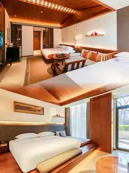 - Garden-view bathtub king room: 180-degree floor-to-ceiling glass facing the courtyard, smart curtains open to a sea of green. The 2-meter king bed is super comfortable, with just the right mattress firmness, making it hard to get up every day.