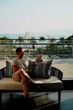 From the moment you step into the lobby, the calm tones and warm natural materials create a transparent and comfortable atmosphere. The rattan and wood decorations complement the blue sea view outside the window.