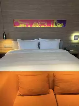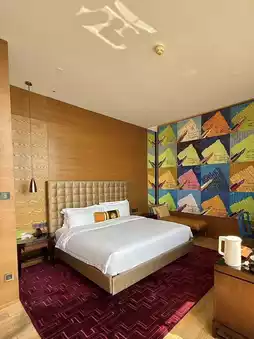 The hotel's interior design features so many colors and materials, yet it is beautifully controlled and not chaotic. The hotel incorporates the design elements of the traditional "sunset glow" and "blue tears," which is impressive.