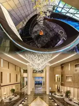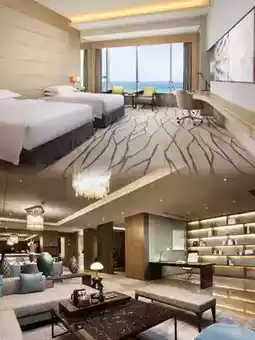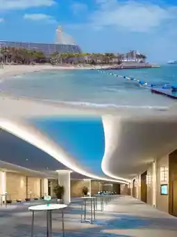 The hotel's exterior features flowing lines that evoke ocean waves, with a blue and white facade that complements the azure sea and sky. Upon entering the lobby, the high ceiling creates a spacious visual effect, while the wave-shaped ceiling and coral branch-inspired chandeliers transport guests to an underwater world. The designers cleverly incorporated traditional Minnan architectural elements, such as red brick walls and decorative latticed bricks, embedding cultural memories within the modern space.