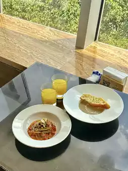 🍲 Unlock culinary surprises at the riverside restaurant! The truffle wild mushroom soup fills the air with mountain forest aromas the moment it's served, while the pan-seared sea bass is absolutely divine🐟—golden crispy skin paired with Mediterranean-style sweet-and-sour seasonal veggies, transporting you straight to a sunny beach paradise with one bite.
