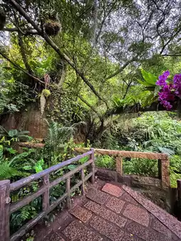 We stepped into Wanshi Botanical Garden as the morning mist was just beginning to lift, the granite boulders rising quietly among lush pockets of green 🌿🪨🌤️. Paths curved around the rocks, leading us through bamboo groves, tropical flowers, and towering palms that filtered the light into soft, shifting patterns. The air smelled of earth and water, cool and steady, as if the garden was breathing in time with the mountain itself.