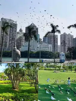 Stroll along the lake 🚶, feed the pigeons 🕊️. Sunlight sprinkles on the shimmering lake surface, and the Egret Goddess statue in the center of the water is gracefully beautiful~ The air is filled with a leisurely scent, a walk around is super healing!