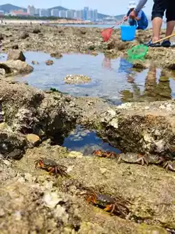 â¨Must-have for tide pooling: Check "Weihai tide table" in advance (search "tide forecast" on WeChat), go to "Seaside Park" one hour before low tide, bring small shovel and bucket (10 RMB/set at roadside shops). Teach kids to gently catch little crabs in rock crevicesâsuper fun;