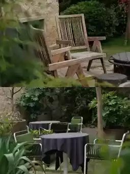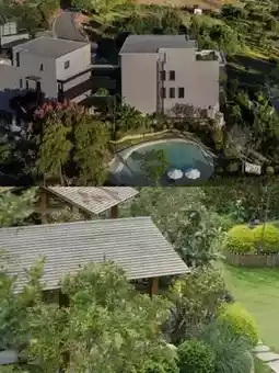 Two buildings crafted from local stone, earthy tones + lush greenery