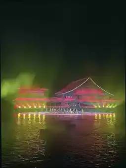 📍Route: Mingde Gate Square (7:45 PM "Mingde Triumph") → East Market Stage (Rainbow Feather Dance) → Zhuque Promenade (8:10 PM "Zhuque Shows National Power") → West Market Lakeside (8:00 PM "Dreamlike Water Show") → Huyu Tower (9:15 PM "Dreaming of Huyu Tower") → Fireworks Show