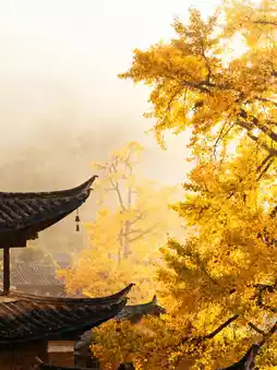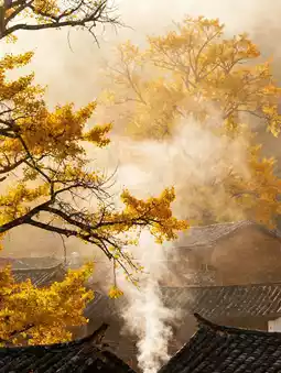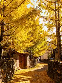 Early in the morning, before the fog clears, smoke rises from the rooftops of the picturesque houses. The golden ginkgo leaves are draped in a golden glow in the morning light. A gentle breeze rustles the fallen leaves. Walking along the ginkgo-covered paths feels like stepping on a golden carpet. Even the breath is filled with the scent of autumn.