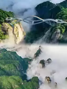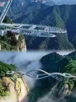 An Internet-famous landmark! The glass bridge spans the canyon and is shaped like a jade Ruyi. When the clouds and mist are lingering, it is like walking in the clouds, meaning "everything goes smoothly." A must-take photo spot.