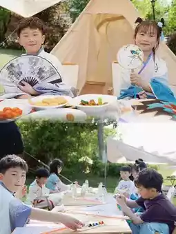 The nearby refreshment area is brimming with an array of snacks, fruits, and drinks 🥪🍇🥤. Guests wander freely through the lush greenery, savoring the treats as laughter and joy fill the air 😆.