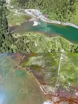 Unique red stone beach on water. 15-min walk to 30m waterfall - feel the alpine cascade's chill.