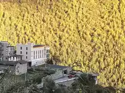 This guesthouse is perched on the edge of a cliff near Changping Valley Scenic Area, featuring panoramic floor-to-ceiling windows in every room! Wake up to the golden glow of sunrise on the mountains, and watch the peaks turn orange-pink at sunset. Even while sipping tea on the balcony, you can admire the colorful forests stretching through the valley.