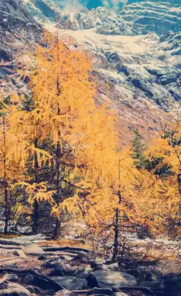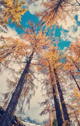 The first stop, with golden larch trees against blue skies and snowy mountains, creating a fairy-tale atmosphere