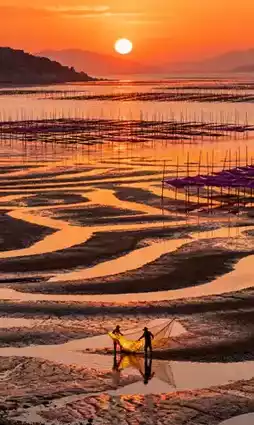 🔹Tidal Flat Light and Shadow Feast: Sunrise on the Beiqi Tidal Flats (golden silhouettes of fishermen casting their nets), Sunset on the Dongbi Tidal Flats (warm orange painting of returning fishing boats)