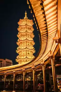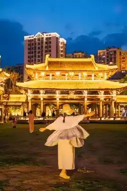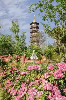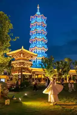 Huaiyuan Pagoda ➡ Tang Poetry Garden ➡ Sunshui Bridge ➡ Tang Style Archway ➡ Huizhou Pavilion ➡ Verbena Flower Sea ➡ Qiongdou Building ➡ Wait for the lights to come on at night to see the night view