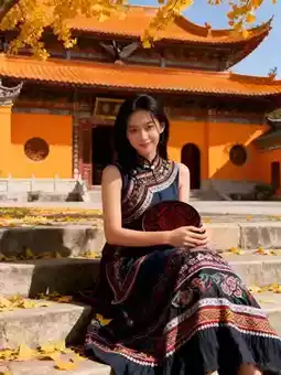 Lingying Temple Red Walls: The orange-red temple walls against the blue sky. Wear the same Charva cloak as in Photo 4 “Lingying Temple Yi-style Girl” (rental 30 RMB/hour). Use your phone’s live mode to capture spinning moments!