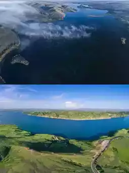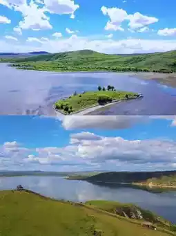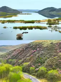 🍃In spring, the ice on Duolun Lake melts, revealing clear waters like a jade embedded among mountains. Duolun Lake consists of seven connected lakes, featuring two lake centers, three peninsulas, and one sandy peninsula. The lakeside has rolling hills, lush forests, and verdant grasslands, creating an intoxicating landscape.