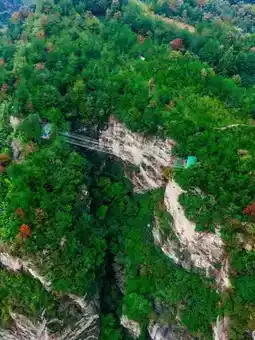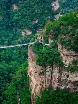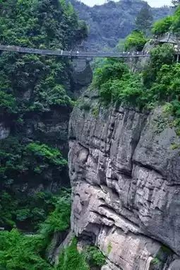An aerial corridor hanging on a cliff, nearly 200 meters long. Walking on it, beneath your feet is a hundred-meter deep abyss, with Danxia cliffs on both sides—thrilling and exciting. The walkway connects two peaks and is the necessary path to higher ground.