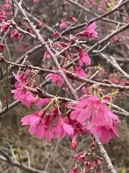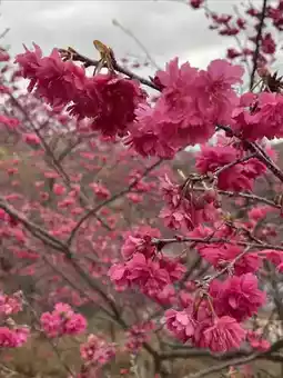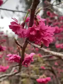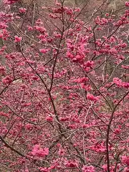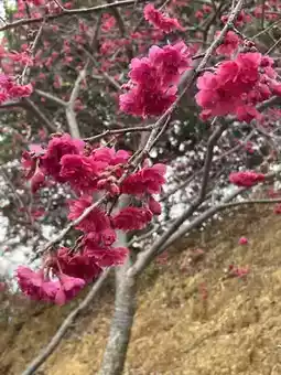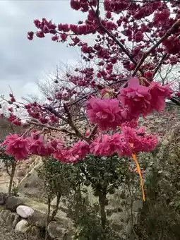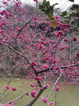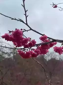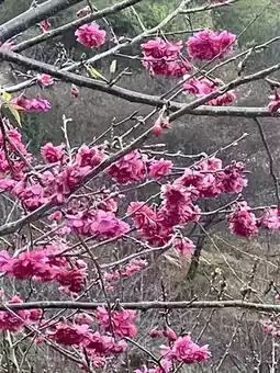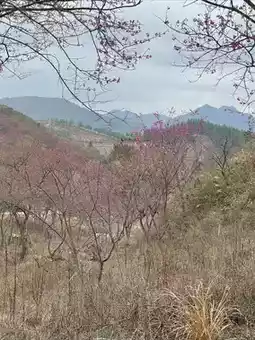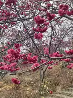The cherry blossoms in Yinghua Valley in Xinfeng County, Guangdong Province bloom successively from January to March. Now it is mid-February, and the winter cherry blossoms are in full bloom, with clusters of purple-red flowers swaying in the spring mist. The flower trees are planted along hills of different sizes, with highs and lows, creating a sense of layering. Unfortunately, there has been no rain in recent months, and the grass on the ground is withered and messy. If the grass sprouts green buds, and the red and green colors are matched, the scenery here should be more beautiful.
