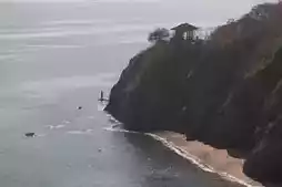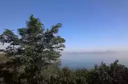 Looking back at the land, the green mountains and trees are lush, contrasting with the blue sea. The pavilions and towers in the scenic area are scattered, adding a touch of cultural charm to this beautiful scenery.