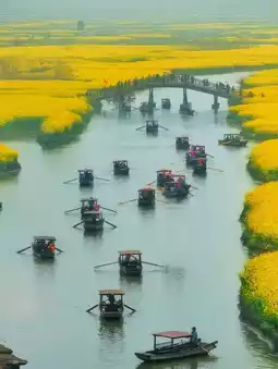 You must take a wooden boat, leisurely walking through the sea of flowers, listening to the gurgling sound of the oars crossing the water, the fragrance of rapeseed flowers lingering on the tip of your nose, as if the whole world has slowed down. The boat moved forward slowly, reaching out to touch the tender yellow petals, and in a trance, it became a part of this spring scenery.