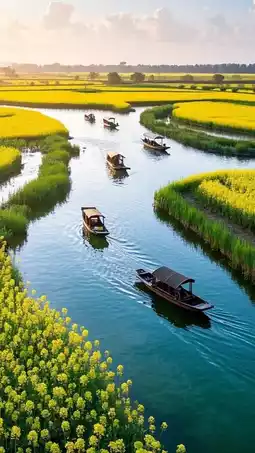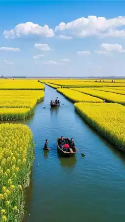 In mid-March, as I drove into Xinghua, the scent of rapeseed flowers already filled the air. Following the navigation towards the Qianduo Scenic Area, the plains outside the car window were gradually segmented by scattered, raised fields, as if the earth were an overturned palette. The cruise terminal at the entrance of the scenic area was crowded with tourists holding cameras. I joined the crowd and boarded a sculling boat. The moment the wooden oars broke the spring water, the rapeseed flower fields on both sides spread out into the distance like golden waves. The boatman's ditty from the Lixiahe region intertwined with the buzzing of bees, and occasionally, egrets skimmed over the sea of flowers, their wings dusted with fragmented sunlight.
