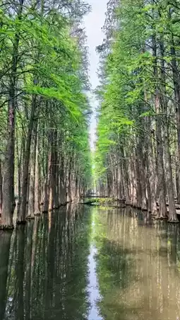Ride a bamboo raft through the water cypress forest, sailing among the trees, feeling like walking in a painting. Sunlight filters through the leaves onto the water, creating beautiful light and shadow!