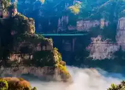 A fully transparent glass bridge suspended hundreds of meters high! The translucent light blue bridge body is embedded in the colorful forest sea. Walking on it feels like a dream, the most unique perspective in autumn.