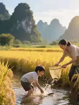 2. Family interaction shots: Use burst mode to capture splashing water moments during rice field fish catching
