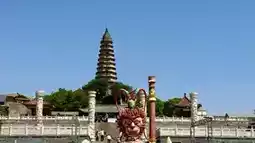 The Longxing Pagoda, built during the Tang Dynasty, originally stood eight stories tall. After collapsing in 1784 during the Qianlong era, it was rebuilt with an outer layer of blue bricks and expanded to 13 stories, now standing 42.4 meters tall. The octagonal pagoda has sides measuring 4.3 meters each and is a pavilion-style brick structure.