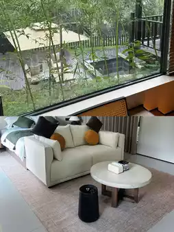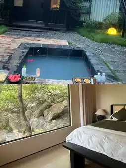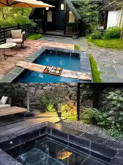 1️⃣ The courtyard is super relaxing, with hot springs ♨️, private pools, saunas, spas, and even a swimming pool! It's perfect for family and couples to unwind 👩👩👧👦. Each room has its own private hot spring, with water sourced from deep underground. You'll feel amazing after a soak.
