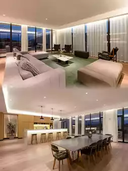 The design inspiration for Huazhu Luxury Residence No. 55 comes from awe and love for the mountains and nature. The exterior of the building features simple, modern lines, combined with natural stone and wood materials, harmoniously blending with the surrounding mountain and forest environment.