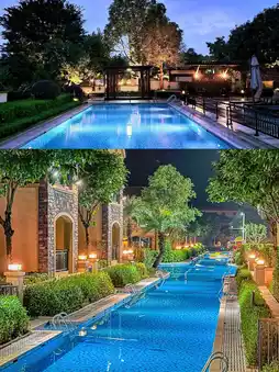 Open the villa door and jump straight into the pool! 🌊 The swimming lanes surround the Spanish-style villa complex. During the day, it is a turquoise ribbon, and at night, when the lights are on, it transforms into a "blue galaxy." Flamingo floats, transparent glass boats, and other props are provided free of charge. You can easily take Instagram-worthy photos (it is recommended to wear bright-colored swimwear + a straw hat for better photos).