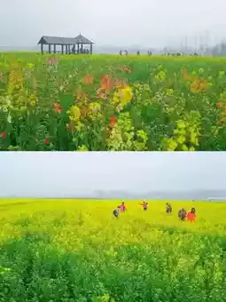 The best viewing period for rapeseed flowers in Minggang Town is from early March to April, and it is currently at its peak. The rapeseed flowers here are known for their vast expanse, covering nearly 1,000 acres, mainly distributed in Xinjicun Village and surrounding areas. Thanks to the mild spring climate in southern Henan, it only takes a week for the fields to go from scattered blossoms to full bloom. Golden waves of flowers undulate in the wind, and the air is filled with a subtle fragrance, making it a popular choice for photography enthusiasts and family outings.