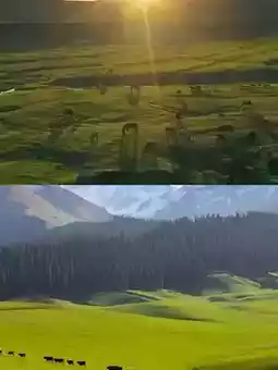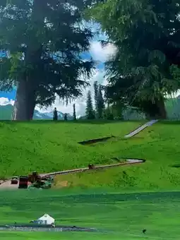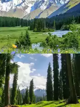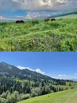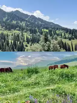 1. **Aerial Grassland**: Round trip 45 km, approx. 3.5 hrs. At a higher altitude, this area offers magnificent views, perfect for flower viewing, photography, and experiencing local ethnic culture. Take the shuttle bus from the Tourist Service Center to Tianjietai, then to Nomadic Family (return from the terminal). It is recommended to spend more time at "Nomadic Family," where you can enjoy various activities such as grassland exploration, local cuisine, horseback riding, admiring snow-capped mountains, and even taking photoshoots.