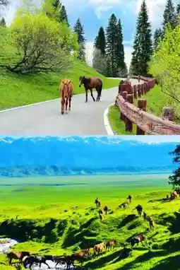 Afternoon: Go to the River Valley Grassland, stroll along the Gongnaisi River, see the spruce forest and cattle and sheep, and if you have time, you can also ride a horse through the grassland🐎.