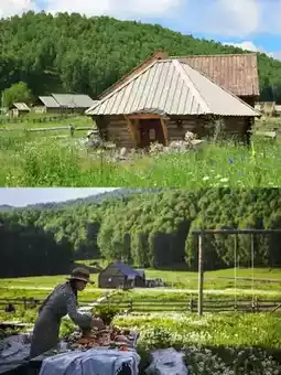 Fairytale log cabins nestled by birch forests, Tuvan-style cozy decor, creating an immersive luxury wilderness vibe