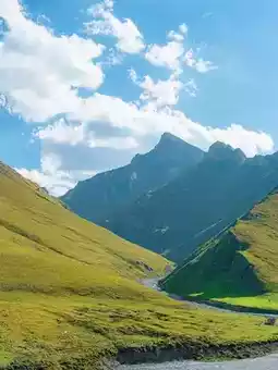 Snow Mountains as Companions: Driving along the grassland valley, snow-capped mountains stretch on both sides of the road, seemingly within reach.