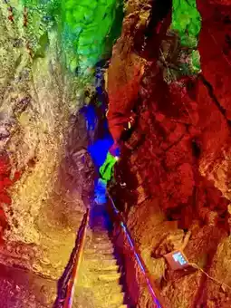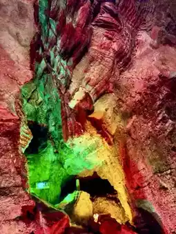 Yuwang Cave resembles a secret realm between heaven and earth, hidden deep within a valley. The cave twists and turns, its walls adorned with a myriad of stalactites, like sculptures frozen in time. Casting a vibrant hue by the light, it feels like entering a natural crystal palace. Every step brings a sense of wonder and excitement, while echoes reverberate through the cave walls, adding to the mystique.