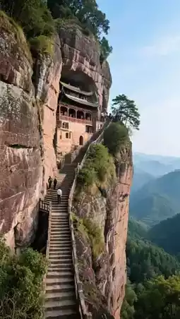 > 📸 Photo spot: Platform in front of the cave, perfect for “Danxia red cliffs + silhouette”