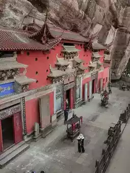 The wonder of Yuxu Palace lies in its "suspended marvel." The entire temple is built on vermilion cliffs, with rock-carved mortise joints and wooden beams inserted.